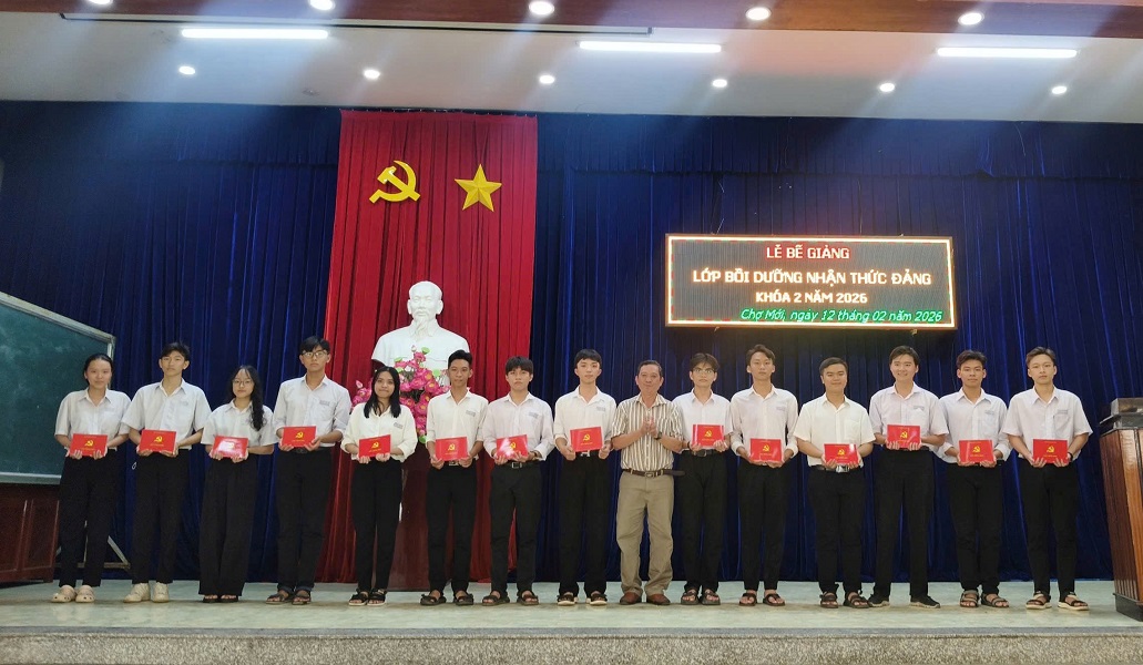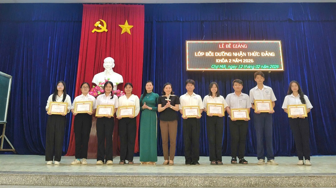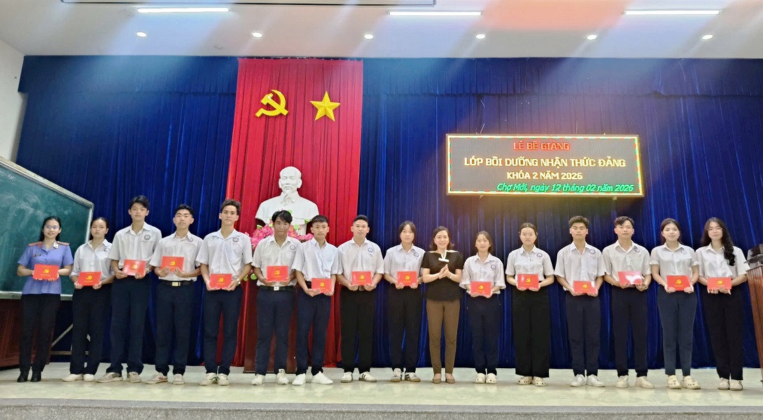 Chiều ngày 12/2/2026, Trung tâm Chính trị xã Chợ Mới tổ chức Lễ Bế giảng lớp Bồi dưỡng nhận thức về Đảng, khóa II năm 2026. Dự Lễ bế giảng có đồng chí Đặng Thị Kim Xuyến - Giám đốc Trung tâm Chính trị xã Chợ Mới cùng 87 học viên là quần chúng ưu tú của các Chi, Đảng bộ tại 6 xã và các đơn vị.