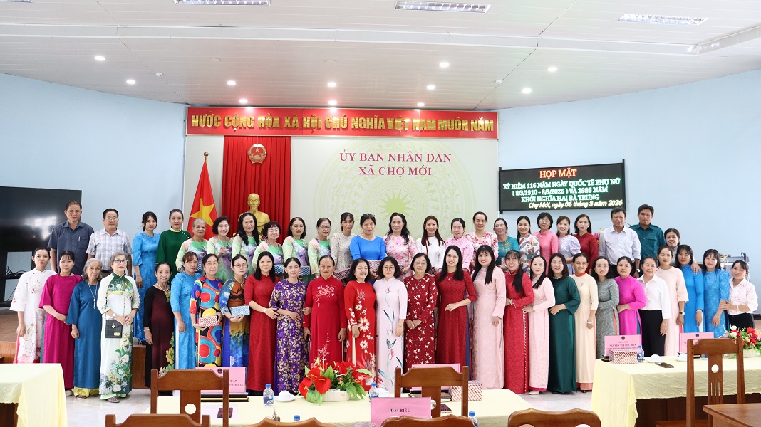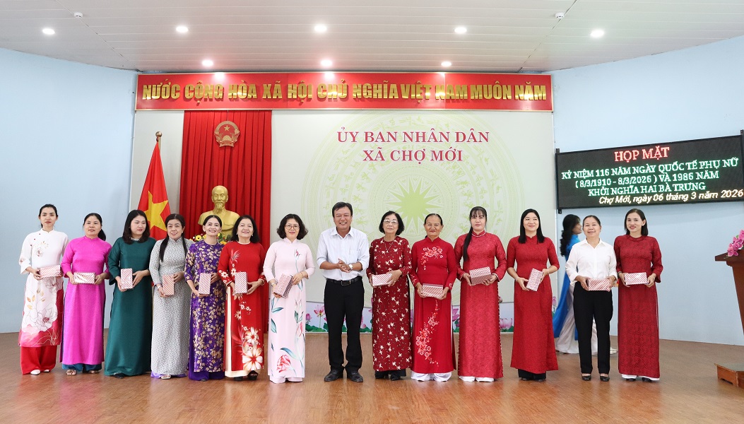 Chiều ngày 06/03/2026, Hội Liên hiệp Phụ nữ xã Chợ Mới tổ chức chương trình họp mặt kỷ niệm 116 năm Ngày Quốc tế Phụ nữ (08/03/1910 - 08/03/2026) và 1986 năm Khởi nghĩa Hai Bà Trưng. Đến dự có đồng chí Huỳnh Thị Nguyệt Hồng - Bí thư Đảng ủy, Chủ tịch HĐND xã; ông Huỳnh Thanh Tuấn - Phó Chủ tịch UBND xã; Cùng nguyên là cán bộ Hội qua các nhiệm kỳ cà cán bộ, hội viên phụ nữ trên địa bàn.