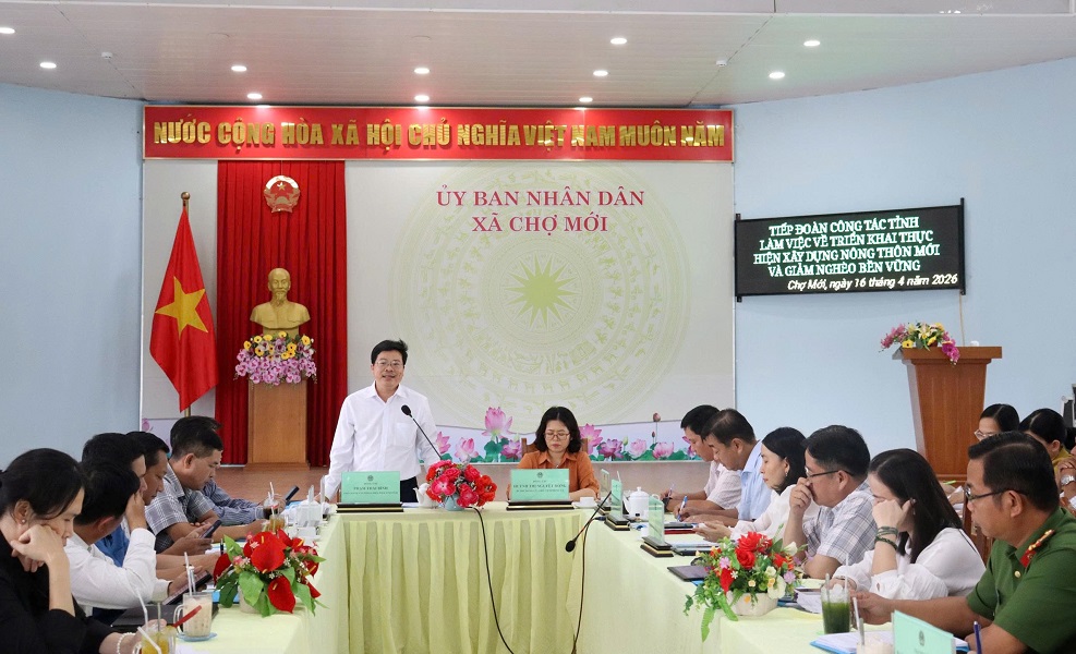 Chiều ngày 16/4/2026, Đoàn công tác tỉnh do ông Phạm Thái Bình - Phó Chánh Văn phòng Điều phối nông thôn mới tỉnh làm Trưởng đoàn có buổi làm việc tại xã Chợ Mới về tình hình triển khai thực hiện Chương trình mục tiêu quốc gia xây dựng nông thôn mới và giảm nghèo bền vững. Tiếp và làm việc có đồng chí Huỳnh Thị Nguyệt Hồng - Bí thư Đảng ủy, Chủ tịch HĐND xã; đồng chí Nguyễn Trọng Trí - Phó Bí thư Đảng ủy, Chủ tịch UBND xã, Trưởng Ban Chỉ đạo chương trình mục tiêu quốc gia xã Chợ Mới.