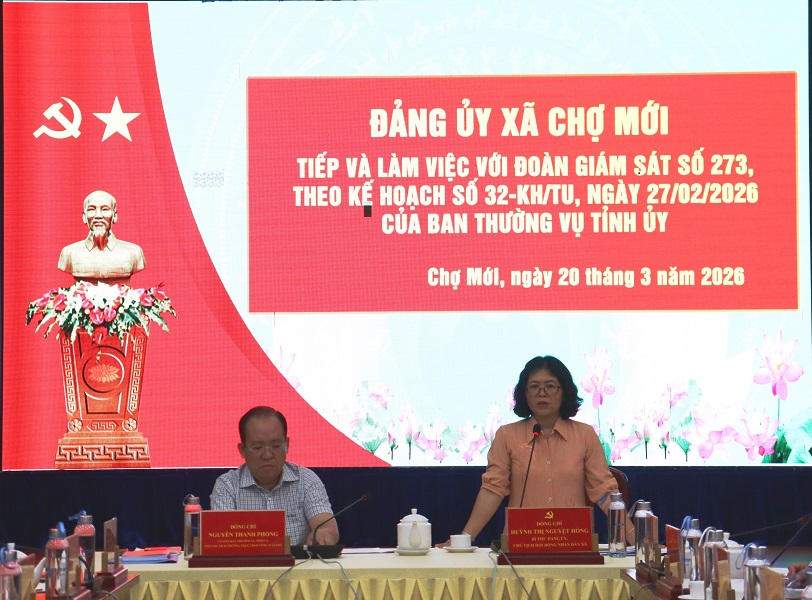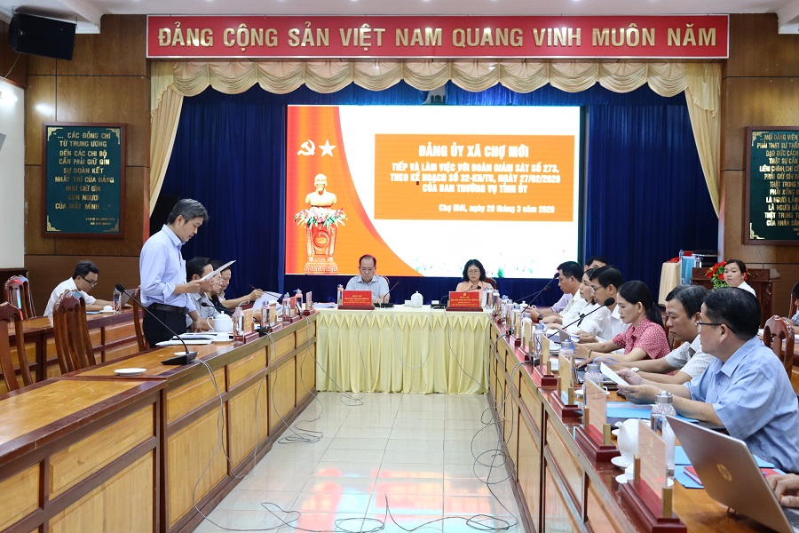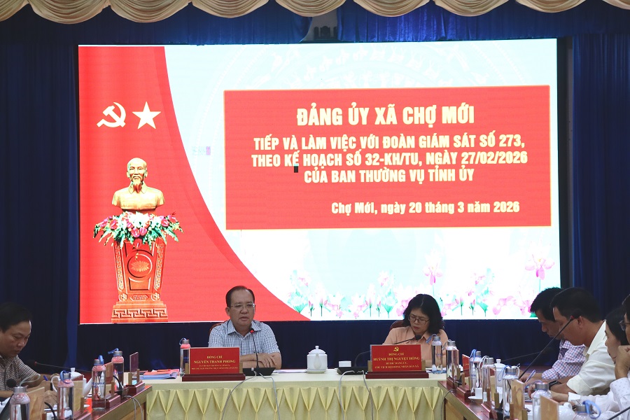 Chiều ngày 20/3, Đoàn Giám sát số 273 của Ban Thường vụ Tỉnh ủy An Giang do đồng chí Nguyễn Thanh Phong - Ủy viên Ban Thường vụ Tỉnh ủy, Phó Chủ tịch Thường trực UBND tỉnh An Giang làm trưởng đoàn có buổi làm việc với Ban Thường vụ Đảng ủy xã Chợ Mới về công tác lãnh đạo, chỉ đạo nghiên cứu, học tập, quán triệt, tuyên truyền và cụ thể hóa thực hiện nghị quyết của Đảng. Tiếp đoàn có có đồng chí Huỳnh Thị Nguyệt Hồng - Bí thư Đảng ủy, Chủ tịch HĐND xã; đồng chí Nguyễn Phước An - Phó Bí thư Thường trực Đảng ủy xã; đồng chí Nguyễn Trọng Trí - Phó Bí thư, Chủ tịch UBND xã.