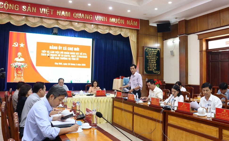 Tại buổi làm việc, đoàn giám sát nghe Ban Thường vụ Đảng ủy xã Chợ Mới báo cáo việc lãnh đạo, chỉ đạo nghiên cứu, học tập, quán triệt, tuyên truyền và triển khai thực hiện Nghị quyết Đại hội đại biểu toàn quốc lần thứ XIV của Đảng và việc cụ thể hóa Chương trình hành động thực hiện Nghị quyết Đại hội Đảng bộ tỉnh An Giang lần thứ I, nhiệm kỳ 2025 – 2030.