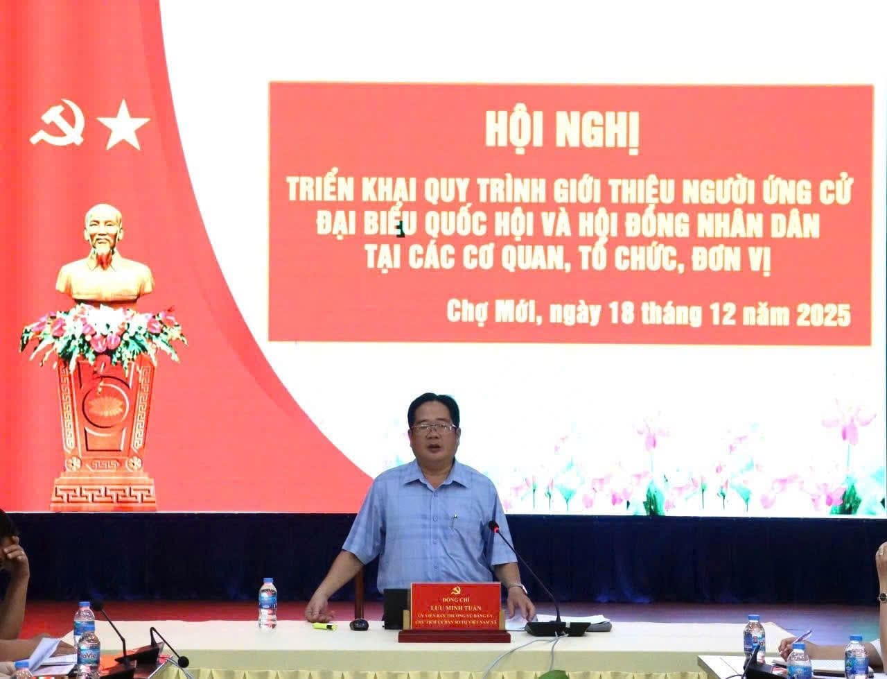 Sáng ngày 18/12/2025, Ban Thường trực Uỷ ban MTTQ xã Chợ Mới tổ chức Hội nghị triển khai quy trình giới thiệu người ứng cử đại biểu Quốc hội và HĐND tại cơ quan, tổ chức, đơn vị. Đồng chí Lưu Minh Tuấn, Uỷ viên Ban Thường vụ Đảng uỷ, Chủ tịch Uỷ ban MTTQ xã chủ trì hội nghị.