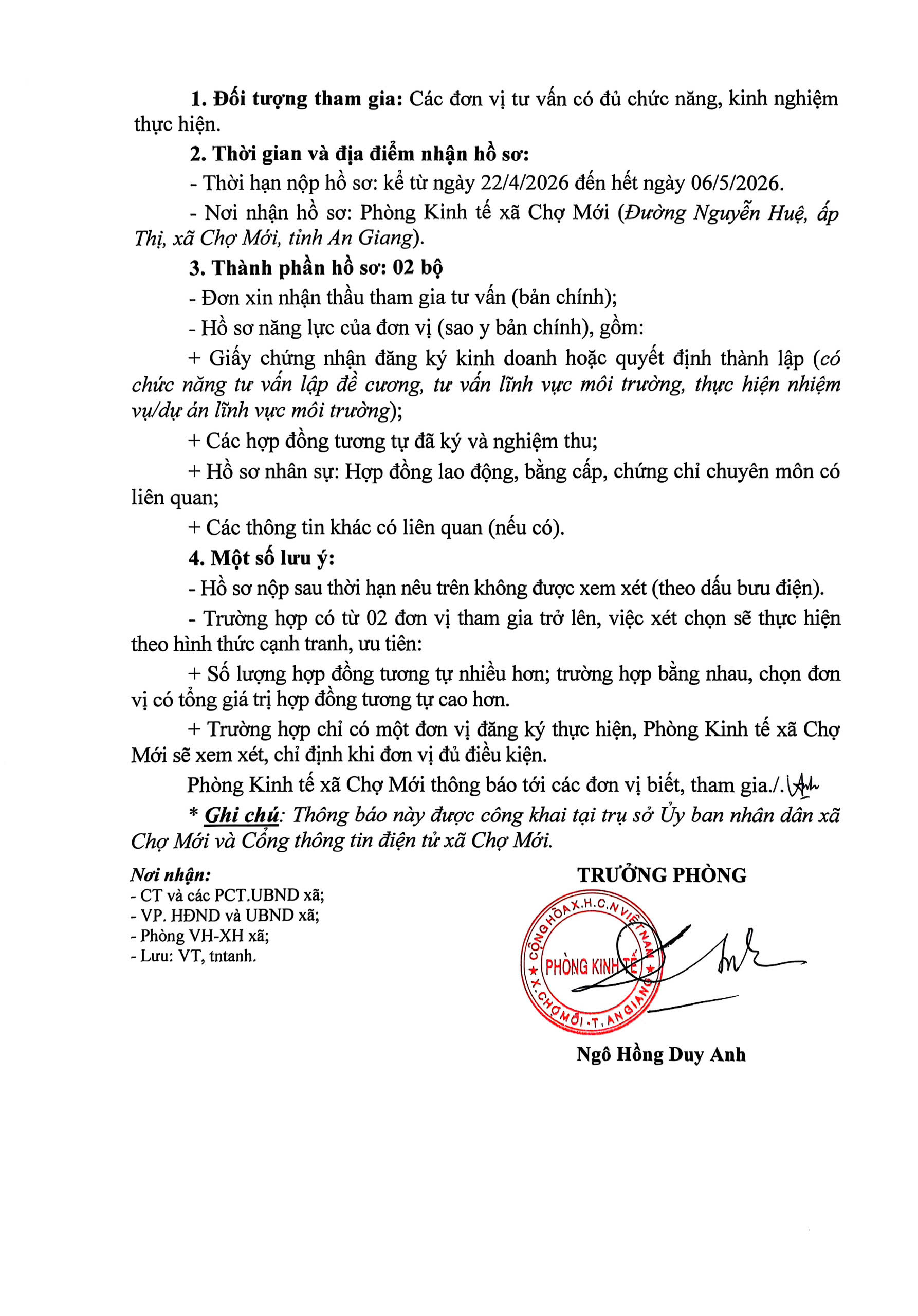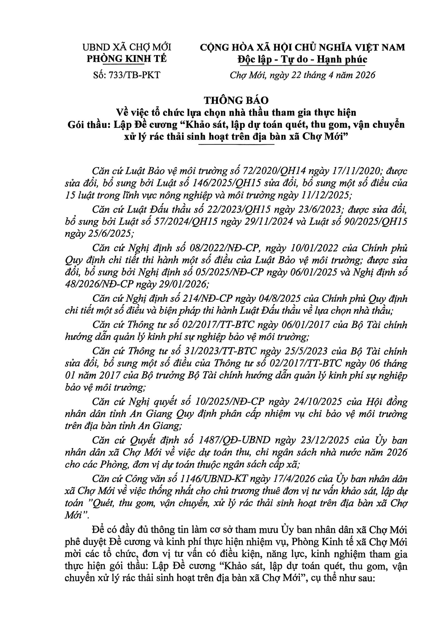 Thông báo về việc tổ chức lựa chọn nhà thầu tham gia thực hiện gói thầu lập đề cương " Khảo sát, lập dự toán quét, thu gom, vận chuyển xử lý rác thải sinh hoạt trên địa bàn xã Chợ Mới"