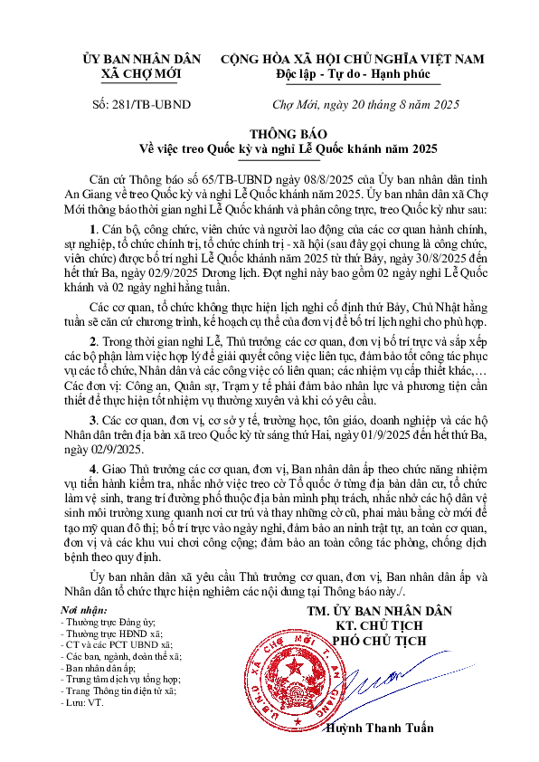 Thông báo về việc treo Quốc kỳ và nghỉ Lễ Quốc khánh năm 2025