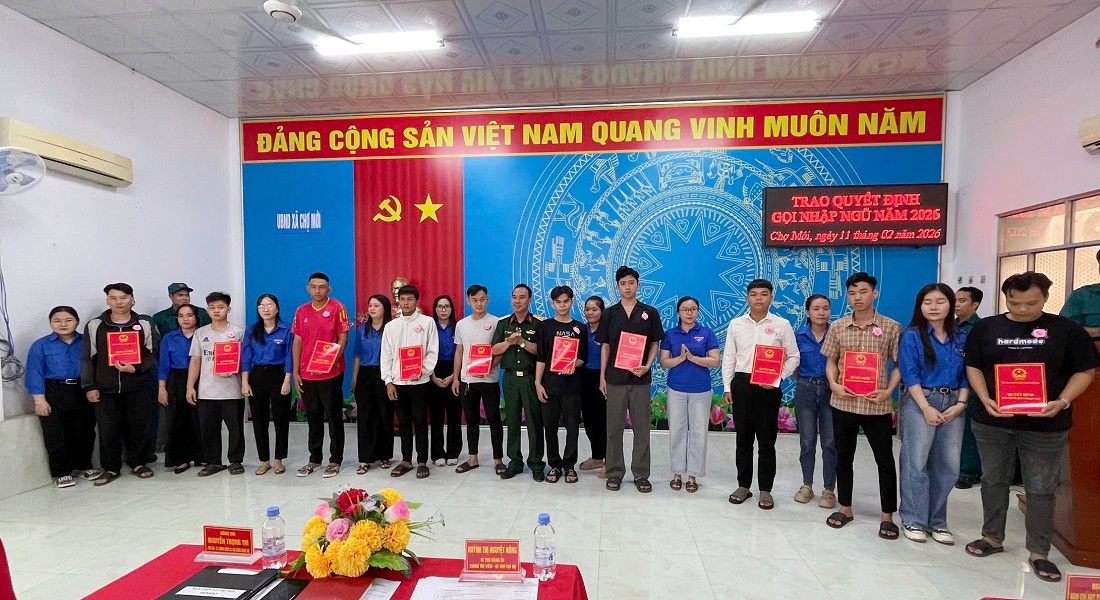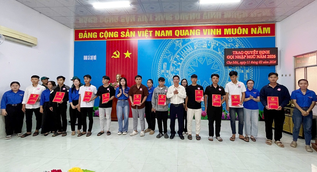 Sáng ngày 11/02/2026, UBND xã Chợ Mới tổ chức lễ trao quyết định gọi công dân nhập ngũ năm 2026. Đến dự có đồng chí Huỳnh Thị Nguyệt Hồng - Bí thư Đảng ủy, Chủ tịch HĐND xã; đồng chí Nguyễn Trọng Trí - Phó Bí thư Đảng ủy, Chủ tịch UBND, Chủ tịch Hội đồng nghĩa vụ Quân sự xã.